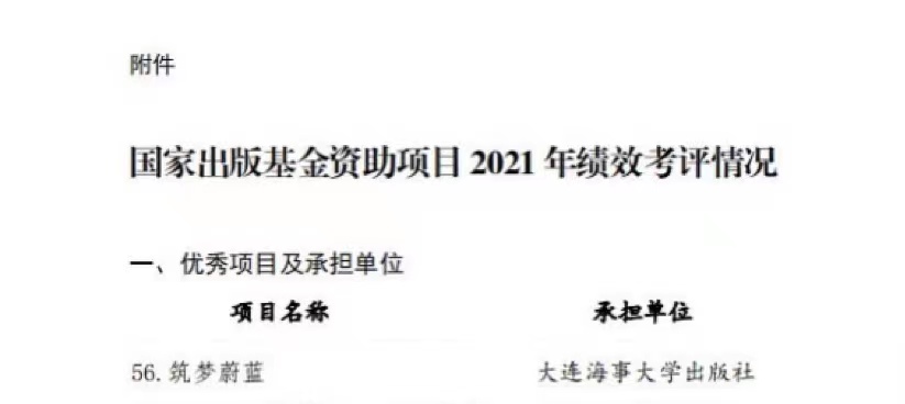 近日,国家出版基金规划管理办公室发布《国家出版基金资助项目2021年绩效考评情况通报》,2021年共有589个项目完成结项验收。从出版质量、社会效益、项目管理等方面对589个项目进行综合绩效考评,其中57个项目被评选为优秀项目,对优秀项目的承担单位予以通报表扬,并分别给予增加1-2个2023年度申报项目名额的奖励。大连海事大学出版社《筑梦蔚蓝》成功入选。