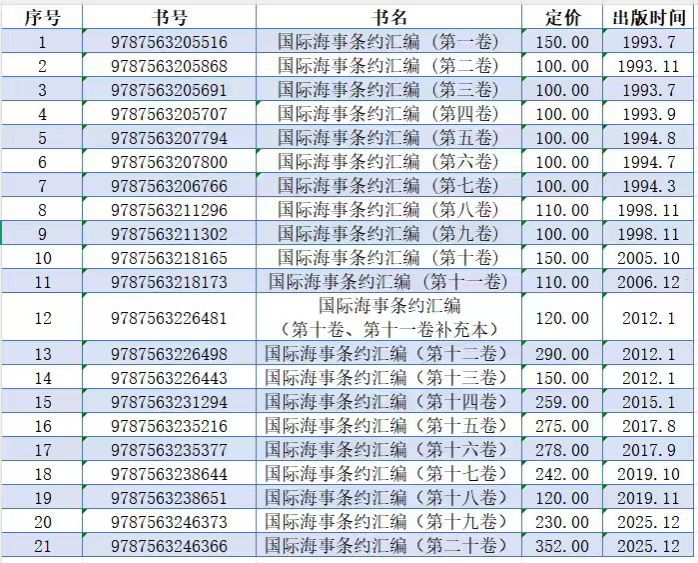 最初的七卷本,系统收录了国际海事组织、联合国贸易和发展会议、国际劳工组织、联合国国际贸易法委员会和国际海事委员会等国际组织制定的与海事有关的国际公约、议定书及其修正案,奠定了其作为行业基础工具书的地位。